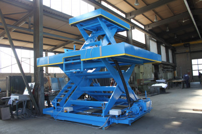 Doppelscheren-Hebebühne zum Transport von Werkzeugmaschinen in die obere Bearbeitungsebene. |