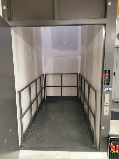 Hebebühne für Gütertransport in einem Schacht, mit Absturzsicherungen und Aufzug-Drehtür abgesichert. |