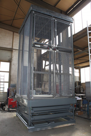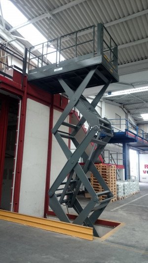 Dreifachscheren-Hebebühne für die Beschickung eines 2.Stockwerkes. Hebebühne incl. Sicherheitszubehöre wie elektromechanisch verriegelte Türen und Geländer |