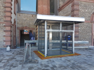 Hebebühne mit 3 gegenüberliegenden Haltestelle mit entsprechend verriegelten Türen. |