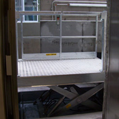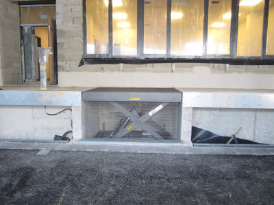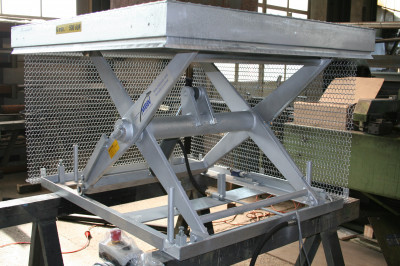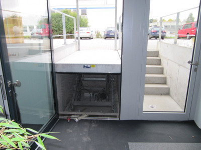 Serien-Hebebühne, für die Beschickung und Entnahme von Waren aus einem tiefer liegenden Lager. |