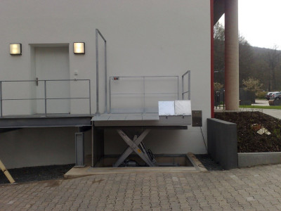 Serienhebebühne, eingesetzt zum Niveauausgleich zwischen zwei Laderampen und dem Hofnivau. |